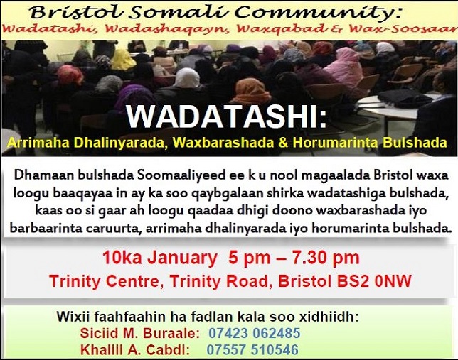 Dhamaan bulshada Soomaaliyeed ee ku nool magaalada Bristol waxa loogu baaqayaa in ay ka soo qaybgalaan shirka wadatashiga bulshada, kaas oo si gaar ah loogu qaadaa-dhigi doono arrimo la xidhiidha waxbarashada caruurta, dhalinyarada iyo horumarinta bulshada.
